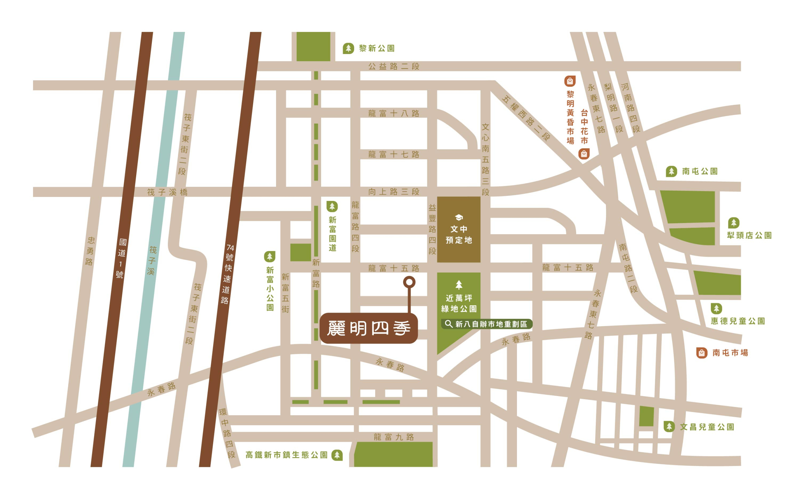 麗明四季座落於龍富十五路,鄰近74號快速道路,南來北往交通十分便利。